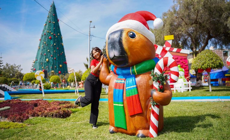 Un hermoso capibara navideño de más de 2 metros de altura se encuentra instalado en la plaza Jorge Chávez para que toda la familia pueda tomarse fotos con el animalito que está de moda.