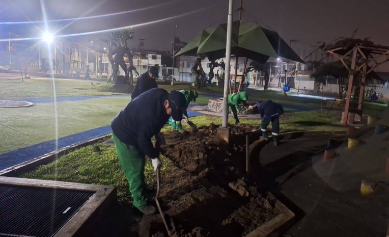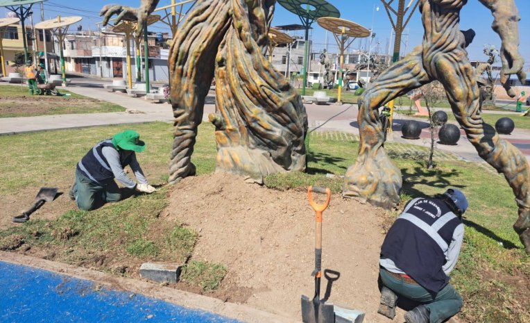 El personal de la Gerencia de Mantenimiento realizó la reposición del grass natural, mantenimiento a las llaves del sistema de agua, reparación de la estructura de las esculturas de árboles entre otros trabajos que continuarán en los próximos días.