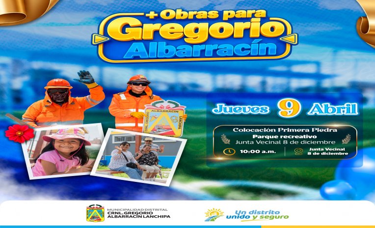 Tags: Gregorio Albarracin GAL munialbarracin Alcalde Tacna PerúAcompáñanos a la colocación de la primera piedra de la obra "Creación de los servicios de espacios públicos urbanos en la J.V. 8 de diciembre" a realizarse este jueves 9 de abril desde las 10:00 a.m.