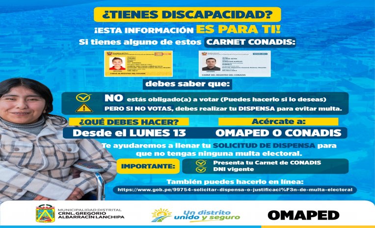La Municipalidad Distrital Crnl. Gregorio Albarracín, a través de OMAPED, informa a la población sobre el proceso de dispensa electoral para personas con discapacidad.