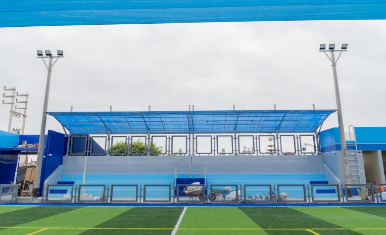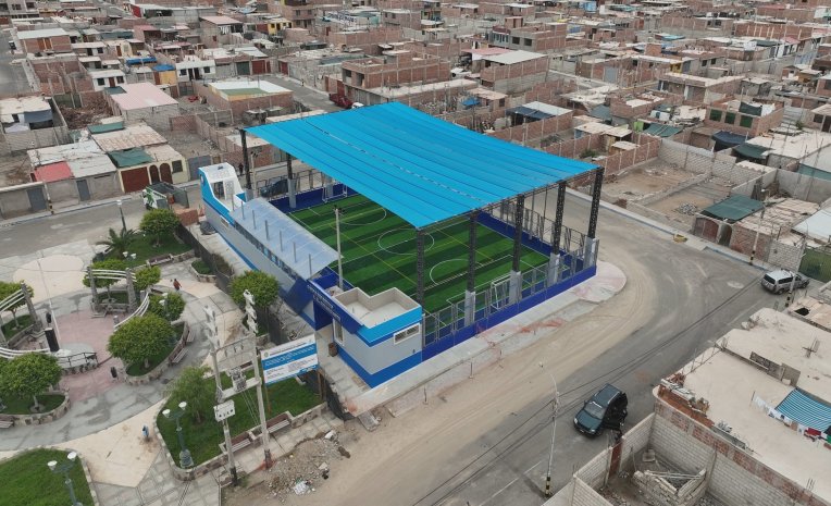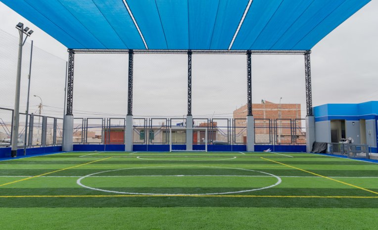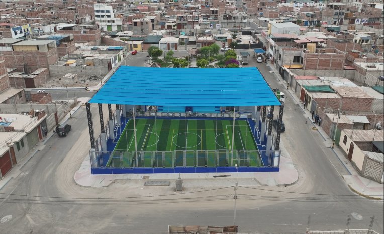 El nuevo campo deportivo que se viene trabajando en un área de 928.85 m², cuenta con dos componentes: infraestructura y equipamiento que incluyen la construcción de un campo multideportivo recreativo de grass sintético con cobertura de malla raschel, graderías, ambiente de guardianía, tribuna, palco, cerco perimétrico, espacio de circulación, peatonal, servicios higiénicos, adquisición de mobiliario deportivo, arcos de fútbol, parentes metálicos y net con base graduable.