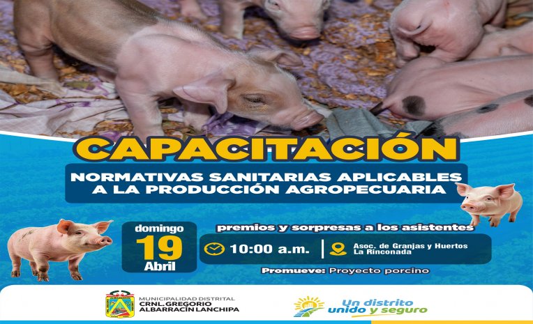 Tags: Gregorio Albarracin GAL munialbarracin Alcalde Tacna PerúEl proyecto porcino de nuestra municipalidad realizará la jornada de capacitación sobre la normativa sanitaria aplicable a la producción agropecuaria este domingo 19 de abril desde las 10:00 a.m. en Asoc. Granjas y Huertas La Rinconada.
