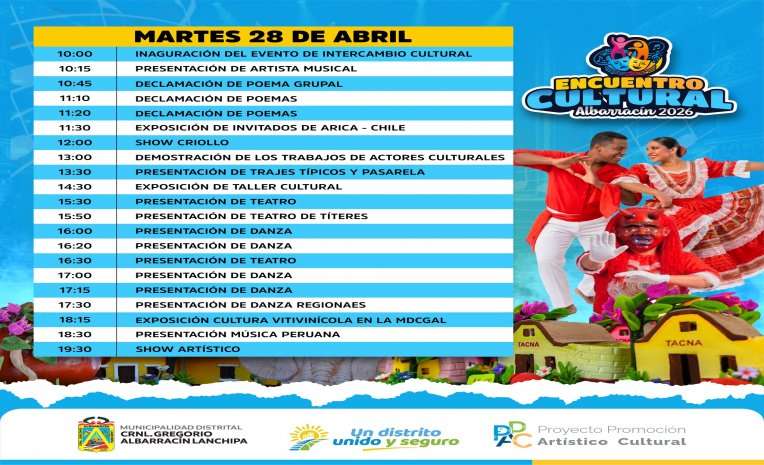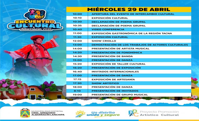 Tags: Gregorio Albarracin GAL munialbarracin Alcalde Tacna PerúEste 28 y 29 de abril desde las 10:00 a. m. en el Polideportivo Los Ediles disfruta de todo el arte visual, artes escénicas, enseñanza cultural, música, gastronomía y más en el Gran Encuentro Cultural Albarracín 2026.